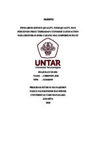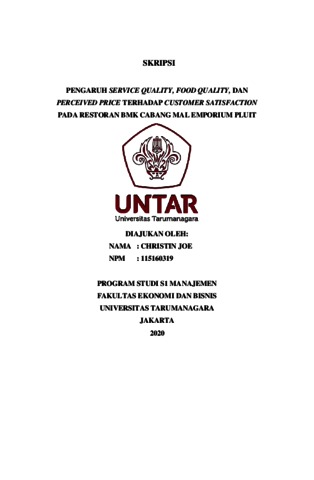 JOE, CHRISTIN (2021) PENGARUH SERVICE QUALITY, FOOD QUALITY, DAN PERCEIVED PRICE TERHADAP CUSTOMER SATISFACTION PADA RESTORAN BMK CABANG MAL EMPORIUM PLUIT. Skripsi thesis, Universitas Tarumanagara.