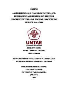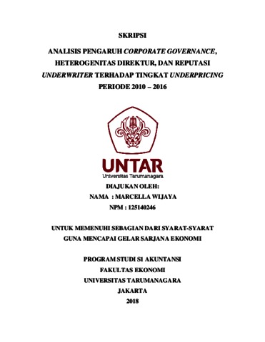 Wijaya, Marcella (2018) ANALISIS PENGARUH CORPORATE GOVERNANCE, HETEROGENITAS DIREKTUR, DAN REPUTASI UNDERWRITER TERHADAP TINGKAT UNDERPRICING PERIODE 2010 – 2016. Skripsi thesis, Universitas Tarumanagara.