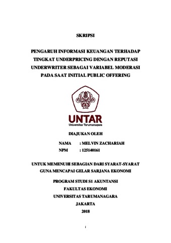 Zachariah, Melvin (2018) PENGARUH INFORMASI KEUANGAN TERHADAP TINGKAT UNDERPRICING DENGAN REPUTASI UNDERWRITER SEBAGAI VARIABEL MODERASI PADA SAAT INITIAL PUBLIC OFFERING. Skripsi thesis, Universitas Tarumanagara.