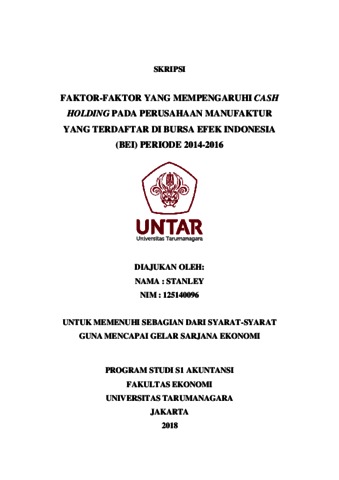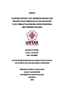 Stanley, Stanley (2018) FAKTOR-FAKTOR YANG MEMPENGARUHI CASH HOLDING PADA PERUSAHAAN MANUFAKTUR YANG TERDAFTAR DI BURSA EFEK INDONESIA (BEI) PERIODE 2014-2016. Skripsi thesis, Universitas Tarumanagara.