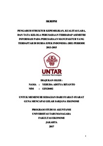 Riyanto, Yehuda Aditya (2017) PENGARUH STRUKTUR KEPEMILIKAN, KUALITAS LABA, DAN TATA KELOLA PERUSAHAAN TERHADAP ASIMETRI INFORMASI PADA PERUSAHAAN MANUFAKTUR YANG TERDAFTAR DI BURSA EFEK INDONESIA (BEI) PERIODE 2013-2015. Skripsi thesis, Universitas Tarumanagara.