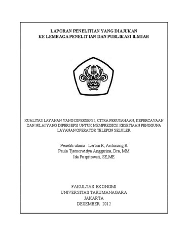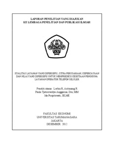 Aritonang, Lerbin R and Anggarina, Paula Tjaturwidya and Puspitowati, Ida (2012) KUALITAS LAYANAN YANG DIPERSEPSI , CITRA PERUSAHAAN, KEPERCAYAAN DAN NILAI YANG DIPERSEPSI UNTUK MEMPREDIKSI KESETIAAN PENGGUNA LAYANAN OPERATOR TELEPON SELULER. Karya Ilmiah Dosen.