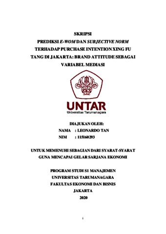 TAN, LEONARDO (2020) PREDIKSI E-WOM DAN SUBJECTIVE NORM TERHADAP PURCHASE INTENTION XING FU TANG DI JAKARTA: BRAND ATTITUDE SEBAGAI VARIABEL MEDIASI. Skripsi thesis, Universitas Tarumanagara.