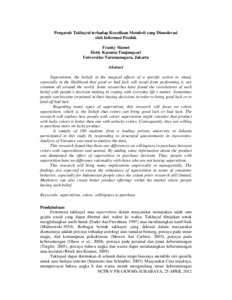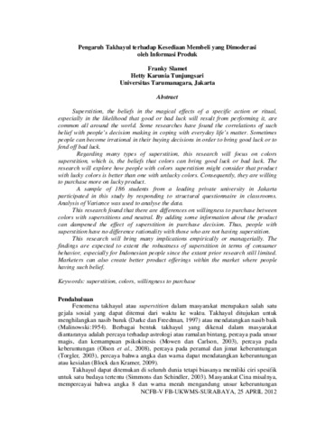 Slamet, Franky and Tunjungsari, Hetty Karunia (2012) Pengaruh Takhayul terhadap Kesediaan Membeli yang Dimoderasi oleh Informasi Produk. Karya Ilmiah Dosen.