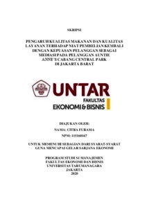 FURAMA, CITRA (2020) PENGARUH KUALITAS MAKANAN DAN KUALITAS LAYANAN TERHADAP NIAT PEMBELIAN KEMBALI DENGAN KEPUASAN PELANGGAN SEBAGAI MEDIASI PADA PELANGGAN AUNTIE ANNE’S CABANG CENTRAL PARK DI JAKARTA BARAT. Skripsi thesis, Universitas Tarumanagara.