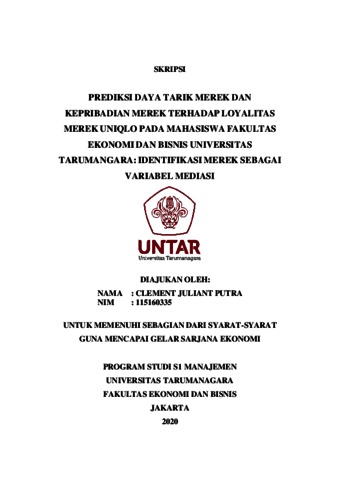 JULIANT PUTRA, CLEMENT (2020) PREDIKSI DAYA TARIK MEREK DAN KEPRIBADIAN MEREK TERHADAP LOYALITAS MEREK UNIQLO PADA MAHASISWA FAKULTAS EKONOMI DAN BISNIS UNIVERSITAS TARUMANGARA: IDENTIFIKASI MEREK SEBAGAI VARIABEL MEDIASI. Skripsi thesis, Universitas Tarumanagara.