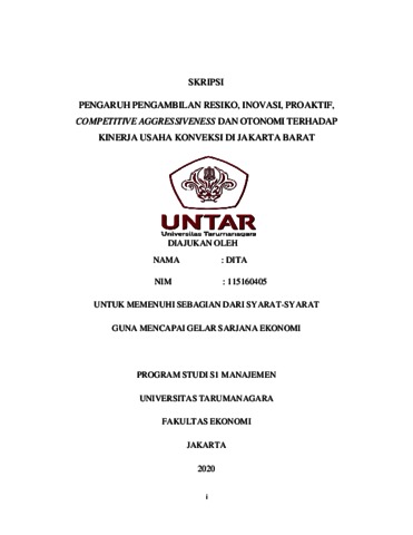 DITA, DITA (2020) PENGARUH PENGAMBILAN RESIKO, INOVASI, PROAKTIF, COMPETITIVE AGGRESSIVENESS DAN OTONOMI TERHADAP KINERJA USAHA KONVEKSI DI JAKARTA BARAT. Skripsi thesis, Universitas Tarumanagara.