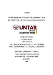 ENRICO, ENRICO (2020) ANALISIS FAKTOR-FAKTOR YANG MEMPENGARUHI INTENSI UNTUK MENGGUNAKAN MOBILE PAYMENT. Skripsi thesis, Universitas Tarumanagara.