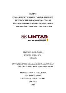 HALIM, IRWANTO (2020) PENGARUH NET WORKING CAPITAL, FIRM SIZE, LEVERAGE TERHADAP CORPORATE CASH HOLDING PADA PERUSAHAAN MANUFAKTUR YANG TERDAFTAR DI BEI TAHUN 2014-2019. Skripsi thesis, Universitas Tarumanagara.