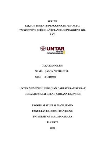 NATHANIEL, JASON (2020) FAKTOR PENENTU PENGGUNAAN FINANCIAL TECHNOLOGY BERKELANJUTAN BAGI PENGGUNA GO-PAY. Skripsi thesis, Universitas Tarumanagara.