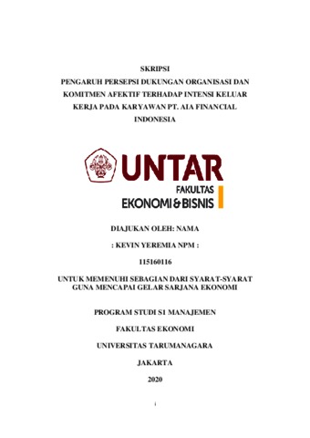 YEREMIA, KEVIN (2020) PENGARUH PERSEPSI DUKUNGAN ORGANISASI DAN KOMITMEN AFEKTIF TERHADAP INTENSI KELUAR KERJA PADA KARYAWAN PT. AIA FINANCIAL INDONESIA. Skripsi thesis, Universitas Tarumanagara.