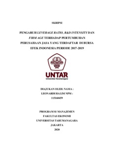 HALIM, LEONARDI (2020) PENGARUH LEVERAGE RATIO, R&D INTENSITY DAN FIRM AGE TERHADAP PERTUMBUHAN PERUSAHAAN JASA YANG TERDAFTAR DI BURSA EFEK INDONESIA PERIODE 2017-2019. Skripsi thesis, Universitas Tarumanagara.