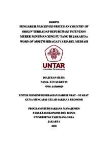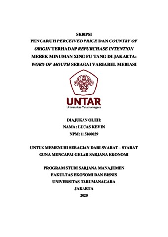 KEVIN, LUCAS (2020) PENGARUH PERCEIVED PRICE DAN COUNTRY OF ORIGIN TERHADAP REPURCHASE INTENTION MEREK MINUMAN XING FU TANG DI JAKARTA: WORD OF MOUTH SEBAGAI VARIABEL MEDIASI. Skripsi thesis, Universitas Tarumanagara.