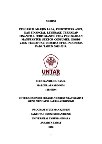 ALVARO, MARCEL (2020) PENGARUH MARJIN LABA, EFEKTIVITAS ASET, DAN FINANCIAL LEVERAGE TERHADAP FINANCIAL PERFOMANCE PADA PERUSAHAAN MANUFAKTUR SEKTOR CONSUMER GOODS YANG TERDAFTAR DI BURSA EFEK INDONESIA PADA TAHUN 2015-2019. Skripsi thesis, Universitas Tarumanagara.
