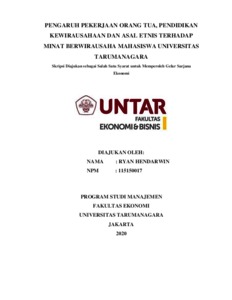 HENDARWIN, RYAN (2020) PENGARUH PEKERJAAN ORANG TUA, PENDIDIKAN KEWIRAUSAHAAN DAN ASAL ETNIS TERHADAP MINAT BERWIRAUSAHA MAHASISWA UNIVERSITAS TARUMANAGARA. Skripsi thesis, Universitas Tarumanagara.