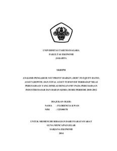 Kwan, Florencia (2014) ANALISIS PENGARUH NET PROFIT MARGIN, DEBT TO EQUITY RATIO, ASSET GROWTH, DAN TOTAL ASSET TURNOVER TERHADAP NILAI PERUSAHAAN YANG DINILAI DENGAN PBV PADA PERUSAHAAN INDUSTRI DASAR DAN BAHAN KIMIA DI BEI PERIODE 2010-2012. Skripsi thesis, UNIVERSITAS TARUMANAGARA.