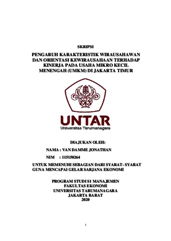 JONATHAN, VAN DAMME (2020) PENGARUH KARAKTERISTIK WIRAUSAHAWAN DAN ORIENTASI KEWIRAUSAHAAN TERHADAP KINERJA PADA USAHA MIKRO KECIL MENENGAH (UMKM) DI JAKARTA TIMUR. Skripsi thesis, Universitas Tarumanagara.