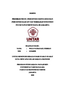 FEBRIAN, WILLI NATHANAEL (2020) PREDIKSI TRUST, PERCEIVED USEFULNESS DAN PERCEIVED EASE OF USE TERHADAP INTENTION TO USE E-PAYMENT DANA DI JAKARTA. Skripsi thesis, Universitas Tarumanagara.