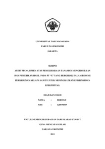 Bernard, Bernard (2011) AUDIT MANAJEMEN ATAS PEMELIHARAAN TANAMAN MENGHASILKAN DAN PEMETIKAN HASIL PADA PT. “X” YANG BERGERAK DALAM BIDANG PERKEBUNAN KELAPA SAWIT UNTUK MENINGKATKAN EFISIENSI DAN EFEKTIFITAS. Skripsi thesis, UNIVERSITAS TARUMANAGARA.