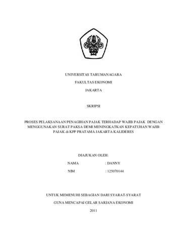Danny, Danny (2011) PROSES PELAKSANAAN PENAGIHAN PAJAK TERHADAP WAJIB PAJAK DENGAN MENGGUNAKAN SURAT PAKSA DEMI MENINGKATKAN KEPATUHAN WAJIB PAJAK di KPP PRATAMA JAKARTA KALIDERES. Skripsi thesis, UNIVERSITAS TARUMANAGARA.