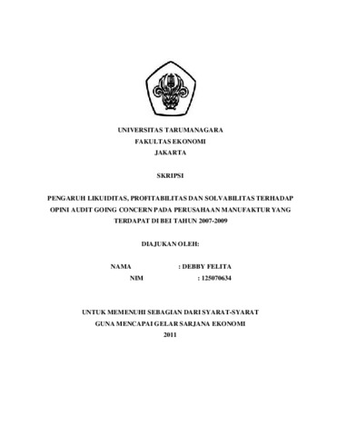 Felita, Debby (2011) PENGARUH LIKUIDITAS, PROFITABILITAS DAN SOLVABILITAS TERHADAP OPINI AUDIT GOING CONCERN PADA PERUSAHAAN MANUFAKTUR YANG TERDAPAT DI BEI TAHUN 2007-2009. Skripsi thesis, UNIVERSITAS TARUMANAGARA.