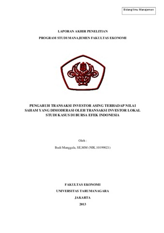 Manggala, Budi (2013) PENGARUH TRANSAKSI INVESTOR ASING TERHADAP NILAI SAHAM YANG DIMODERASI OLEH TRANSAKSI INVESTOR LOKAL STUDI KASUS DI BURSA EFEK INDONESIA. Karya Ilmiah Dosen.
