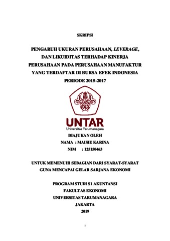 Karina, Maisie (2020) PENGARUH UKURAN PERUSAHAAN, LEVERAGE, DAN LIKUDITAS TERHADAP KINERJA PERUSAHAAN PADA PERUSAHAAN MANUFAKTUR YANG TERDAFTAR DI BURSA EFEK INDONESIA PERIODE 2015-2017. Skripsi thesis, UNIVERSITAS TARUMANAGARA.