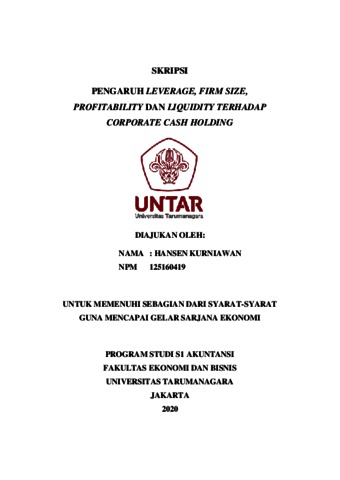 Kurniawan, Hansen (2020) PENGARUH LEVERAGE, FIRM SIZE, PROFITABILITY DAN LIQUIDITYTERHADAP CORPORATE CASH HOLDING. Skripsi thesis, UNIVERSITAS TARUMANAGARA.