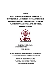 Desianita, Angela (2020) PENGARUH HARGA TRANSFER, KEPEMILIKAN INSTITUSIONAL DAN DISPERSI GEOGRAFI TERHADAP TAX AVOIDANCE PADA PERUSAHAAN MANUFAKTUR YANG TERDAFTAR DI BURSA EFEK INDONESIA PERIODE 2015-2018. Skripsi thesis, UNIVERSITAS TARUMANAGARA.