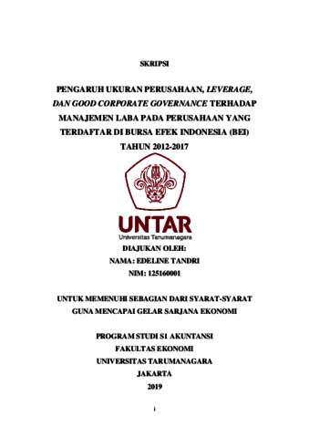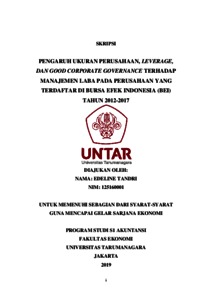 Tandri, Edeline (2020) PENGARUH UKURAN PERUSAHAAN, LEVERAGE, DAN GOOD CORPORATE GOVERNANCE TERHADAP MANAJEMEN LABA PADA PERUSAHAANYANG TERDAFTAR DI BURSA EFEK INDONESIA (BEI) TAHUN 2012-2017. Skripsi thesis, UNIVERSITAS TARUMANAGARA.