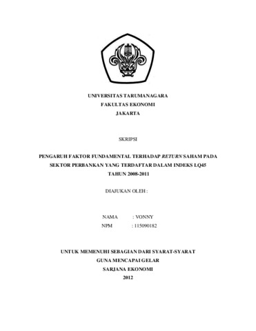 Vonny, Vonny (2013) PENGARUH FAKTOR FUNDAMENTAL TERHADAP RETURN SAHAM PADA SEKTOR PERBANKAN YANG TERDAFTAR DALAM INDEKS LQ45 TAHUN 2008-2011. Skripsi thesis, Universitas Tarumanagara.