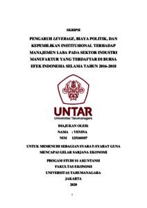 Venina, Venina (2020) PENGARUH LEVERAGE, BIAYA POLITIK, DAN KEPEMILIKAN INSTITUSIONAL TERHADAP MANAJEMEN LABA PADA SEKTORINDUSTRI MANUFAKTUR YANG TERDAFTAR DI BURSA EFEK INDONESIASELAMA TAHUN 2016-2018. Skripsi thesis, UNIVERSITAS TARUMANAGARA.