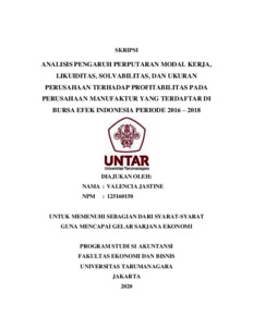 Jastine, Valencia (2020) ANALISIS PENGARUH PERPUTARAN MODAL KERJA,LIKUIDITAS, SOLVABILITAS, DANUKURAN PERUSAHAANTERHADAP PROFITABILITAS PADA PERUSAHAAN MANUFAKTUR YANG TERDAFTAR DI BURSA EFEK INDONESIA PERIODE 2016 – 2018. Skripsi thesis, UNIVERSITAS TARUMANAGARA.