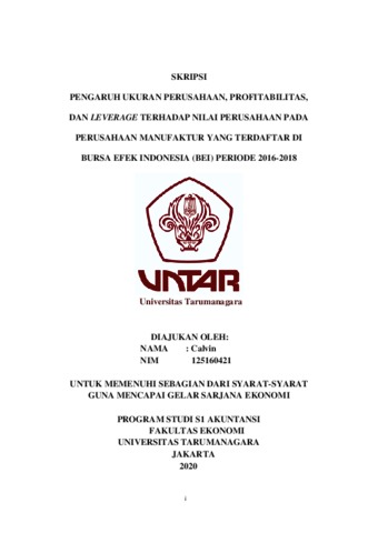 Calvin, Calvin (2020) PENGARUH UKURAN PERUSAHAAN, PROFITABILITAS, DAN LEVERAGE TERHADAP NILAI PERUSAHAAN PADA PERUSAHAAN MANUFAKTUR YANG TERDAFTAR DI BURSA EFEK INDONESIA (BEI) PERIODE 2016-2018. Skripsi thesis, UNIVERSITAS TARUMANAGARA.