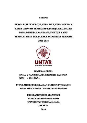 Cahyana, Alvina Maria Krisanthi (2020) PENGARUH LEVERAGE, FIRM SIZE, FIRM AGE DAN SALES GROWTH TERHADAP KINERJA KEUANGAN PADA PERUSAHAAN MANUFAKTUR YANG TERDAFTAR DI BURSA EFEK INDONESIA PERIODE 2016-2018. Skripsi thesis, UNIVERSITAS TARUMANAGARA.
