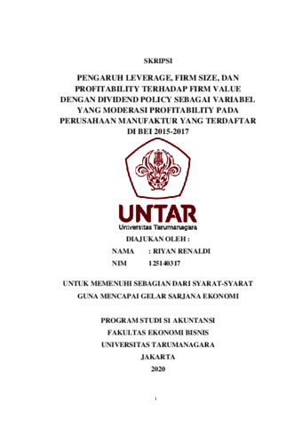 Renaldi, Riyan (2020) PENGARUH LEVERAGE , FIRM SIZE , DAN PROFITABILITY TERHADAP FIRM VALUE DENGAN DIVIDEND POLICY SEBAGAI VARIABEL YANG MODERASI PROFITABILITY PADA PERUSAHAAN MANUFAKTUR YANG TERDAFTAR DI BEI 2015-2017. Skripsi thesis, UNIVERSITAS TARUMANAGARA.