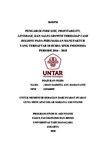 Damayanti, Dian Sasmita Ayu (2020) PENGARUH FIRM SIZE, PROFITABILITY, LEVERAGE, DAN SALES GROWTH TERHADAP CASH HOLDING PADA PERUSAHAAN MANUFAKTUR YANG TERDAFTAR DI BURSA EFEK INDONESIA PERIODE 2016 - 2018. Skripsi thesis, UNIVERSITAS TARUMANAGARA.