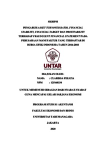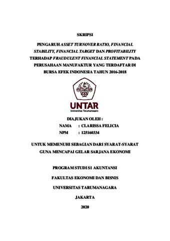 Felicia, Clarissa (2020) PENGARUH ASSET TURNOVER RATIO, FINANCIAL STABILITY, FINANCIAL TARGET DAN PROFITABILITY TERHADAP FRAUDULENT FINANCIAL STATEMENT PADA PERUSAHAAN MANUFAKTUR YANG TERDAFTAR DI BURSA EFEK INDONESIA TAHUN 2016-2018. Skripsi thesis, UNIVERSITAS TARUMANAGARA.