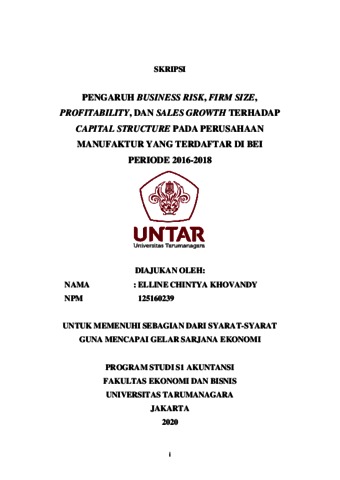 Khovandy, Elline Chintya (2020) PENGARUH BUSINESS RISK, FIRM SIZE, PROFITABILITY DAN SALES GROWTH TERHADAP CAPITAL STRUCTURE PADA PERUSAHAAN MANUFAKTUR YANG TEDAFTAR DI BEI PERIODE 2016-2018. Skripsi thesis, UNIVERSITAS TARUMANAGARA.
