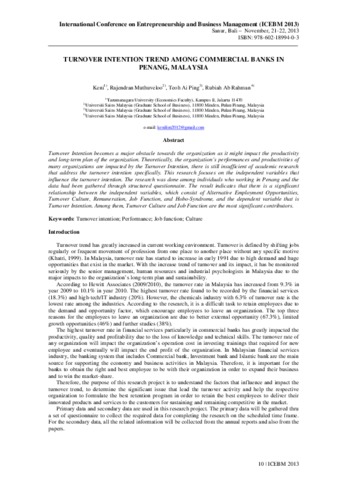 Keni, Keni and Muthuveloo, Rajendran and Ping, Teoh Ai and Rahman, Rubiah Ab (2013) TURNOVER INTENTION TREND AMONG COMMERCIAL BANKS IN PENANG, MALAYSIA. Karya Ilmiah Dosen. pp. 10-15. ISSN 978-602-18994-0-3