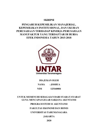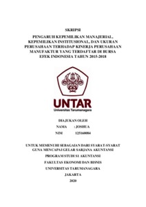 Joshua, Joshua (2020) Pengaruh Kepemilikan Manajerial, Kepemilikan Institusional, Dan Ukuran Perusahaan Terhadap Kinerja Perusahaan Manufaktur Yang Terdaftar Di Bursa Efek Indonesia Tahun 2015-2018. Skripsi thesis, UNIVERSITAS TARUMANAGARA.