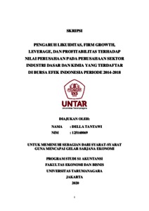 Tantawi, Della (2020) Pengaruh Likuiditas, Firm Growth, Leverage, Dan Profitabilitas Terhadao Nilai Perusahaan Pada Perusahaan Sektor Industri Dasar Dan Kimia Yang Terdaftar Di Bursa Efek Indonesia Periode 2014-2018. Skripsi thesis, UNIVERSITAS TARUMANAGARA.