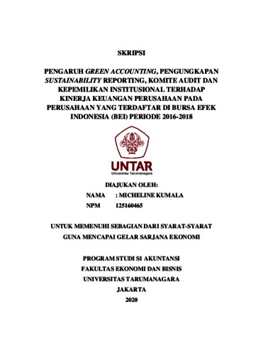 Kumala, Micheline (2020) Pengaruh Green Accounting, Pengungkapan Sustainability Reporting, Komite Audit Dan Kepemilikan Institusinal Terhadap Kinerja Keuangan Perusahaan Pada perusahaan Yang Terdaftar Di Bursa Efek Indonesia (BEI) Periode 2016-2018. Skripsi thesis, UNIVERSITAS TARUMANAGARA.