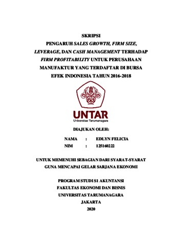 Felicia, Edlyn (2020) PENGARUH SALES GROWTH, FIRM SIZE LEVERAGE, DNA CASH MANAGEMENT TERHADAP FIRM PROFITABILITY UNTUK PERUSAHAAN MANUFAKTUR YANG TERDAFTRA DI BURSA EFEK INDONESIA. Skripsi thesis, UNIVERSITAS TARUMANAGARA.