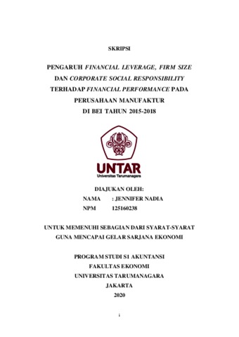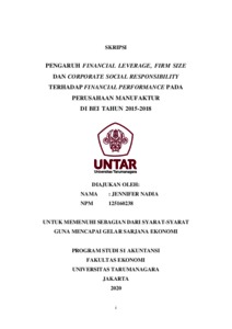 Nadia, Jennifer (2020) PENGARUH FINANCIAL LEVERAGE, FIRM SIZE DAN CORPORATE SOCIAL RESPONSIBILITY TERHADAP FINANCIAL PERFORMANCE PADA PERUSAHAAN MANUFAKTUR DI BEI TAHUN 2015-2018. Skripsi thesis, UNIVERSITAS TARUMANAGARA.