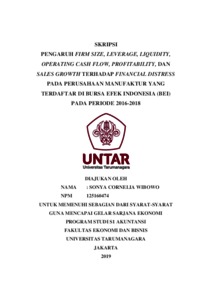 Wibowo, Sonya Cornelia (2020) PENGARUH FIRM SIZE, LEVERAGE, LIQUIDITY, OPERATING CASH FLOW, PROFITABILITY, DAN SALES GROWTH TERHADAP FINANCIAL DISTRESS PADA PERUSAHAAN MANUFAKTUR YANG TERDAFTAR DI BURSA EFEK INDONESIA (BEI) PADA PERIODE 2016-2018. Skripsi thesis, UNIVERSITAS TARUMANAGARA.