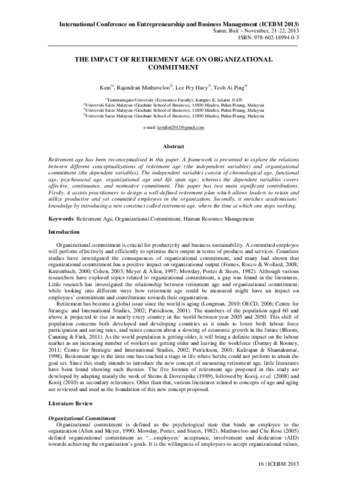 Keni, Keni and Muthuveloo, Rajendran and Huey, Lee Pey and Ping, Teoh Ai (2013) THE IMPACT OF RETIREMENT AGE ON ORGANIZATIONAL COMMITMENT. Karya Ilmiah Dosen. pp. 16-22. ISSN 978-602-18994-0-3