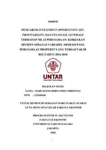 Christian, Marcelino Hernando (2020) PENGARUH INVESTMENT OPPORTUNITY SET, PROFITABILITY, DAN FINANCIAL LEVERAGE TERHADAP NILAI PERUSAHAAN: KEBIJAKAN DIVIDEN SEBAGAI VARIABEL MEDIASI PADA PERUSAHAAN PROPERTI YANG TERDAFTAR DI BEI TAHUN 2016-2018. Skripsi thesis, Universitas Tarumanagara.