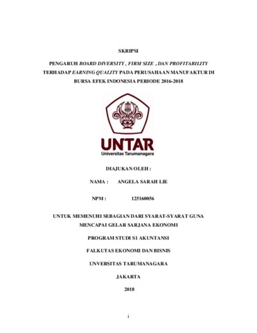 Lie, Angela Sarah (2020) PENGARUH BOARD DIVERSITY , FIRM SIZE , DAN PROFITABILITY TERHADAP EARNING QUALITY PADA PERUSAHAAN MANUFAKTUR DI BURSA EFEK INDONESIA PERIODE 2016-2018. Skripsi thesis, UNIVERSITAS TARUMANAGARA.