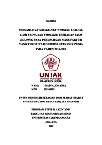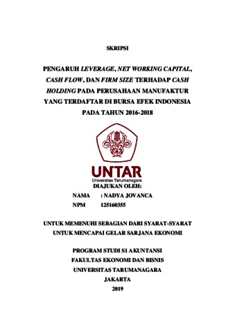 JOVANCA, NADYA (2020) PENGARUH LEVERAGE, NET WORKING CAPITAL, CASH FLOW, DAN FIRM SIZE TERHADAP CASH HOLDING PADA PERUSAHAAN MANUFAKTUR YANG TERDAFTAR DI BURSA EFEK INDONESIA PADA TAHUN 2016-2018. Skripsi thesis, Universitas Tarumanagara.